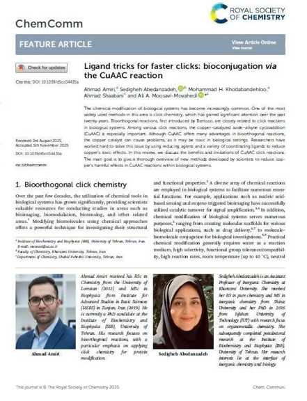 سرکار خانم دکتر عابدان زاده عضو محترم هیات علمی دانشکده شیمی  چاپ مقاله ارزشمند شما در قالب مقاله برجسته “Feature article“ با عنوان: Ligand tricks for faster clicks: bioconjugation via CuAAC reaction در مجله وزین و پر سابقه (Chemical Communications) با h-index :۳۸۷ تحت انتشارات انجمن سلطنتی شیمی انگلستان (RSC) را به حضرتعالی و خانواده دانشگاه خوارزمی تبریک عرض می کنیم. با آرزوی تندرستی و توفیقات روزافزون برای شما.